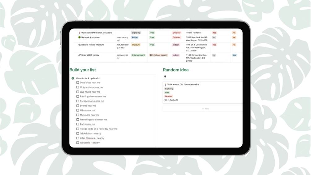- Filter ideas by indoor or outdoor, whether or not you've been, etc. to find the perfect activity for your date. Or, use the random idea the template has generated from your list!